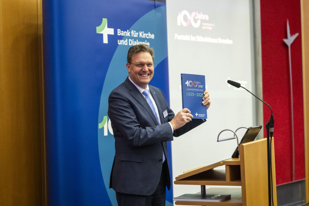 In diesem Jahr stand unser 100-jähriges Bankjubiläum im Fokus. Anfang Oktober haben wir am Gründungsort Dresden, wo die Geschichte der Bank vor 100 Jahren begann, einen Festakt begangen: Uwe von Seltmann ist der Autor unserer Jubiläumschronik, die Prof. Dr. Volker Heinke, Vorsitzender des Aufsichtsrates der KD-Bank, dem Festpublikum zeigte. Nach dem Festakt ging es mit dem Dampfer Dresden auf die Elbe. Natürlich haben auch die Mitarbeitenden an den verschiedenen Standorten auf das Jubiläum angestoßen. In der Bildergalerie sehen Sie Eindrücke vom Empfang in Dortmund.